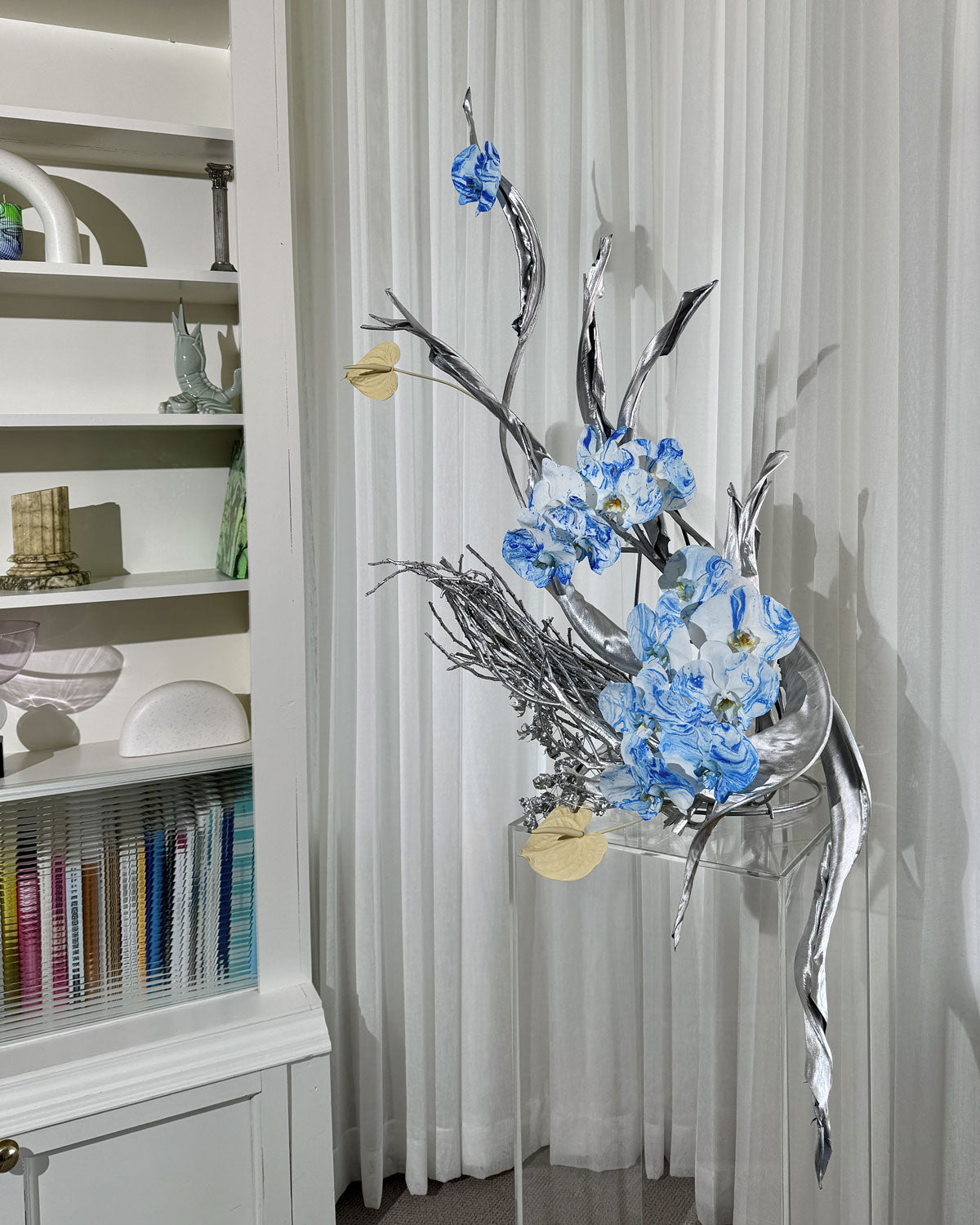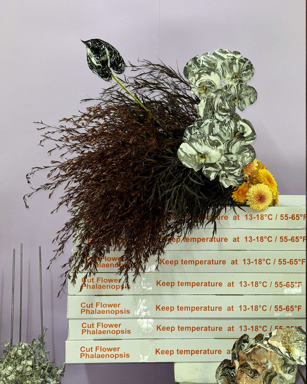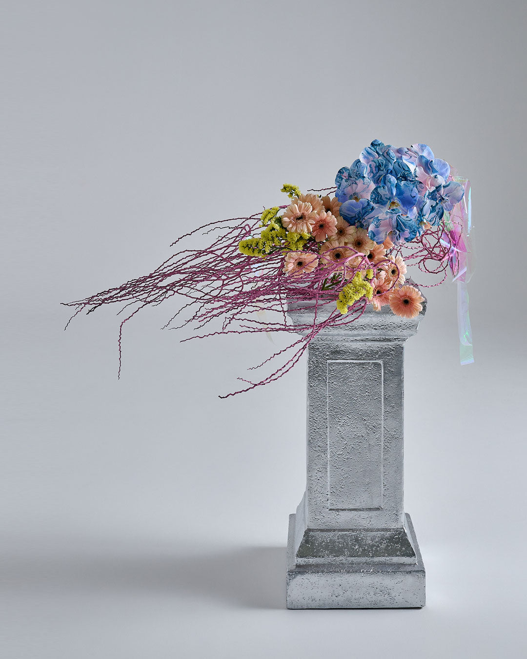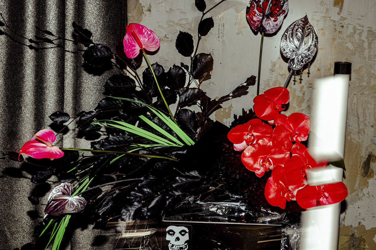 Mixed floral arrangements combine sculptural botanical elements with ACID.FLWRS signature painted flowers.