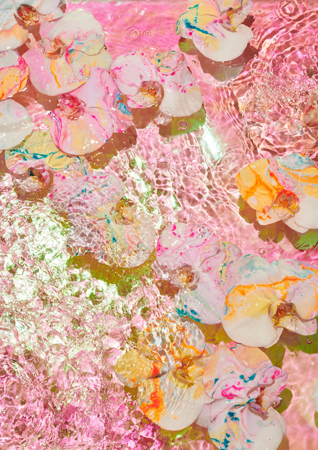 Drawing on techniques developed while styling beauty product, AF and photographer Sevak Babakhani present tropical-hued Acid Phalaenopsis in a surreal moment of colour and movement. Pastel and neon flowers are suspended in pink water scattered with holographic light, refracting wonder in every ripple. An ethereal series that will brighten any interior space.