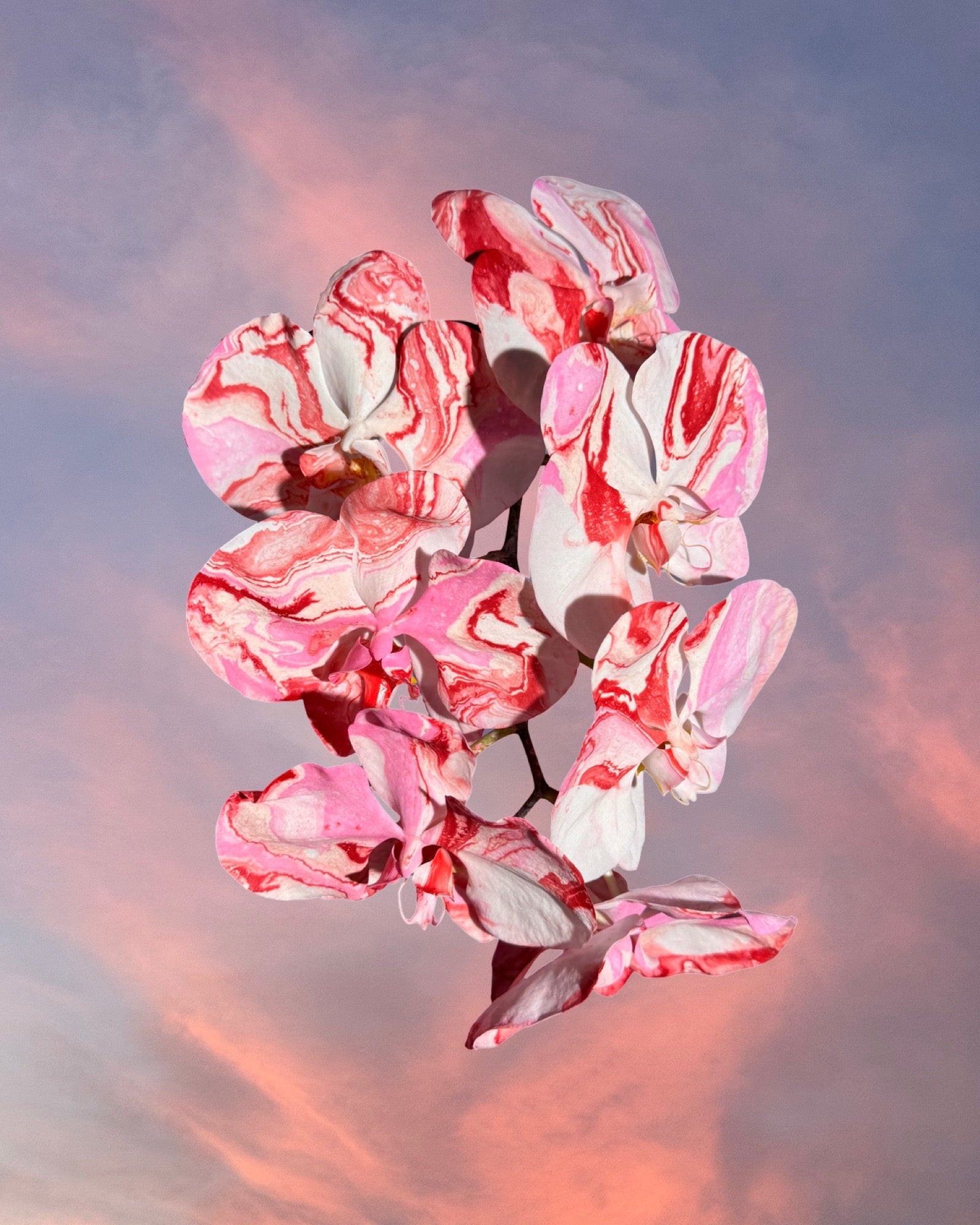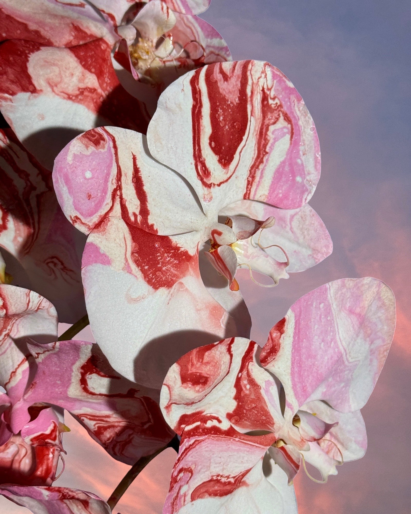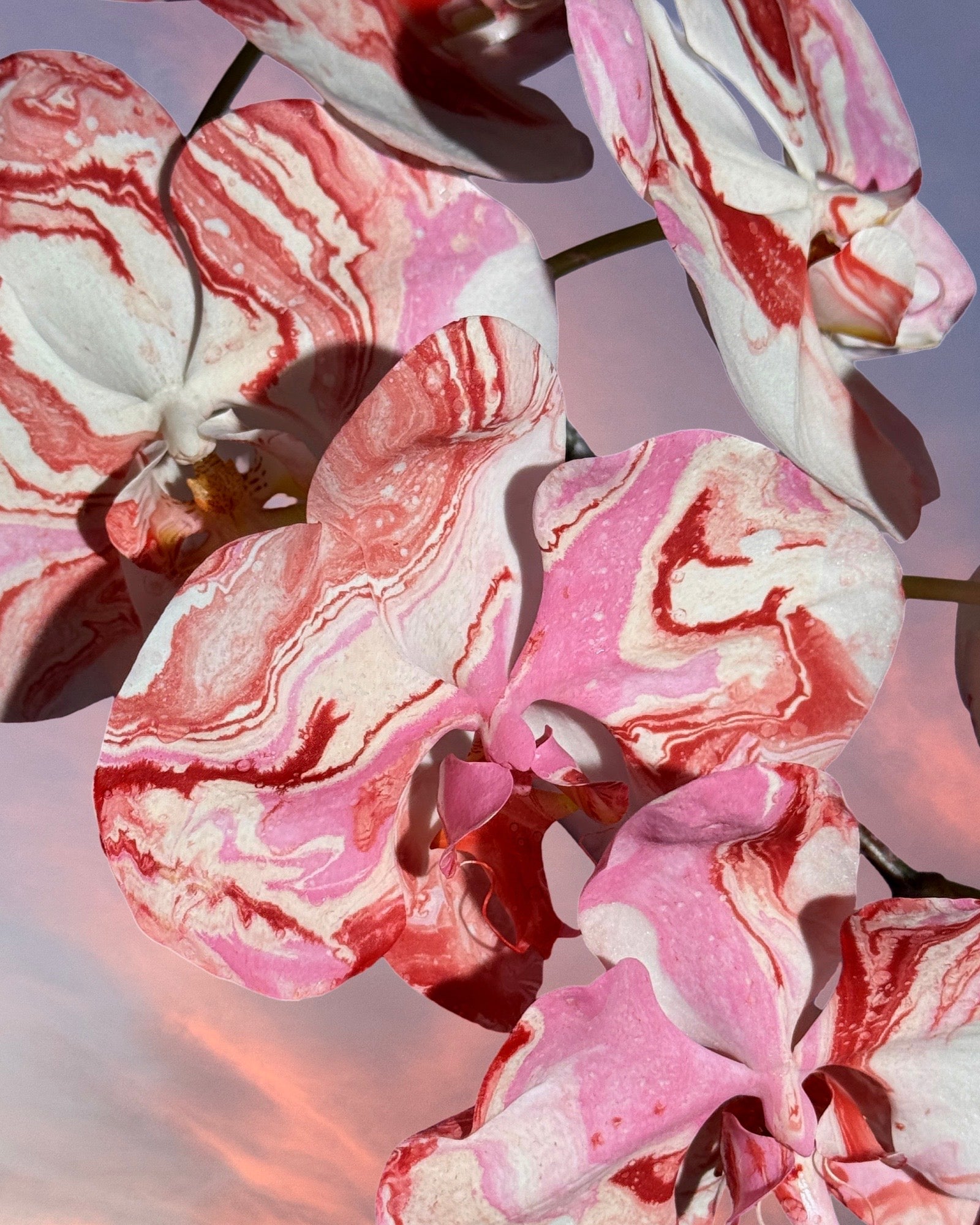 Two orchid stems, custom painted in either pink / red swirls or chrome / neon splatter.